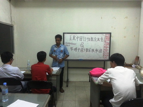 12月13日,柬埔寨王家研究院孔子学院金边华商文化中心汉语中心按预定的工作计划继续开展“每周中国文化活动”,本周邀请到了孔子学院优秀学员王虎(Keath Piseth),作为2015世界大学生“汉语桥”柬埔寨赛区亚军得主暨第十四届“汉语桥”世界大学生中文比赛观摩夏令营营员、2015柬埔寨中文歌曲大赛冠军得主,他十分热情地向学员们展示了各项他擅长的中华才艺,并分享了“汉语桥”比赛、参加HSK考试和三次赴华体验学习的心得体会。