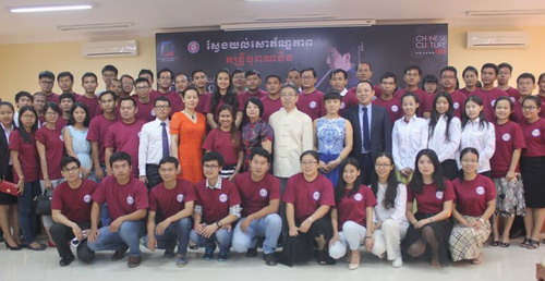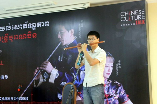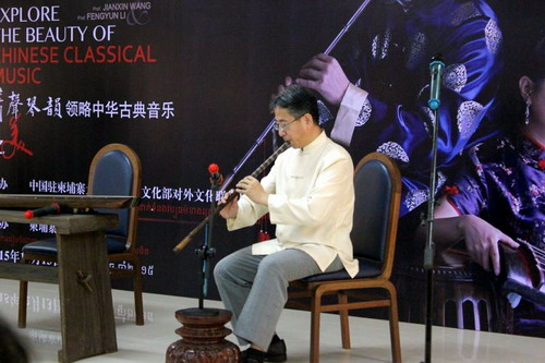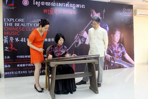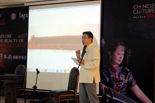 12月13日,由中国驻柬埔寨大使馆和中国文化部对外文化联络局主办,柬埔寨中国校友会协办的中华古典音乐讲座在柬埔寨王家研究院孔子学院成功举办。此次讲座的主讲人是来自天津音乐学院的著名音乐家王建欣教授和李凤云教授。参加这次讲座的主要嘉宾有中国文化部对外文化局副处长张**先生、中国驻柬埔寨大使馆文化处负责人韩静女士和柬埔寨中国校友会代会长斯维娜丽女士等。