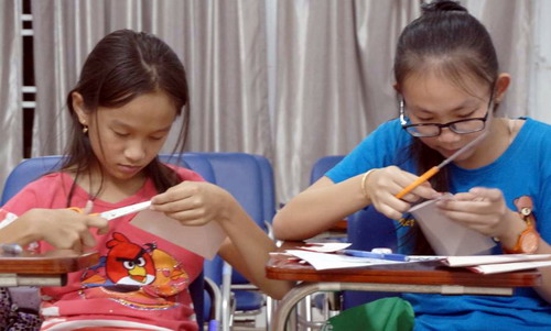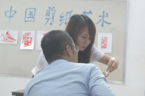 活动开始前,学生们欣赏了主讲人梁卉婕老师静心剪刻的 “年年有余”、“蝶恋花”、“竹报平安”、“羊年大吉”、“喜上眉梢”、“读书娃”等精美的剪纸作品,对中国的剪纸艺术赞不绝口、跃跃欲试。在学生们的期待中,主讲人以PPT形式向大家介绍了中国剪纸的发展和起源、应用、题材及寓意、种类、刀法及纹饰等。在学生们深入了解中国剪纸中蕴含的一些文化内涵之后,教师们开始给学生们分发剪刀、红纸等工具材料,主讲教师从折纸、画图、刀法等方面展开了囍字剪纸、对称图形剪纸、窗花剪纸剪和复杂图案的迭剪教学,一步步将此次活动推向了高潮。学生们一步步跟着老师耐心学习,每当完成一个作品之后,都兴奋地举起手中的作品向大家展示成果,有的学生还能在教师的指导之下开始了八团窗花的自由创作。
