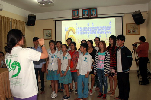 12月30日,柬埔寨王家研究院孔子学院学生在汉语教师志愿者的引领下,齐聚孔子学院大楼门前,共同祝贺孔子学院六周年生日、迎接新的2016年。