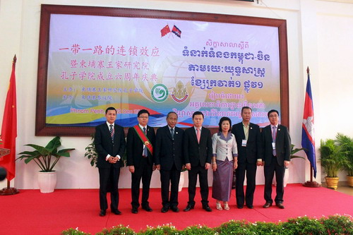 12月22日孔子学院六周年庆当天,柬埔寨王家研究院孔子学院在柬埔寨参议院会议厅举行了6周年庆典暨 “ ‘一带一路’连锁效应” 国际圆桌会议。柬中友好协会会长、柬埔寨宪法理事会主席艾森沃阁下(HE Mr. Ek Samol),