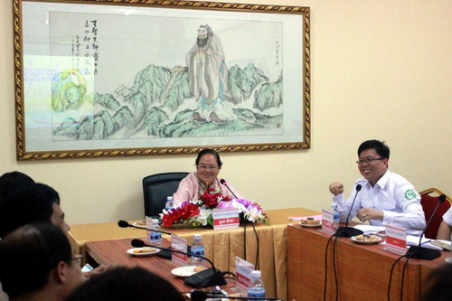 副校长杨耀防教授,中国驻柬埔寨大使馆政治处程洪波主任出席会议。程洪波主任对柬埔寨王家研究院孔子学院成立6周年表示了祝贺,对孔子学院6年来的工作成果给予了极大的肯定。下午,孔子学院师生在孔子学院本部大楼举行庆孔子学院成立6周年座谈会。柬埔寨王家研究院院长、孔子学院理事长克洛媞达院士(HE KHLOT Thyda),索安(SOK An)副总理助理德沈纳院士(HE TECH Samnang),王家研究院副院长逊春文院士(HE SUM Chhum Bun)等参加了座谈会。座谈会上,大家共同观看孔子学院6周年宣传片、五湖四海祝福孔子学院视频集锦,克洛媞达院士、谢莫尼勒院长发表了重要讲话,对孔子学院未来工作作了展望。