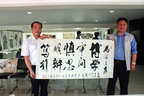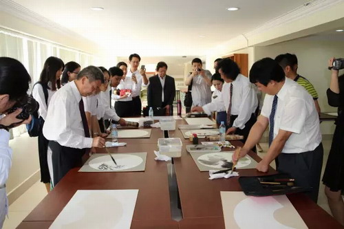 开幕式后,美术家们即席挥毫,现场作画,所画的竹、梅、花、鸟都栩栩如生。著名美术家孙本胜现场题写“博学 审问 慎思 明辨 笃行”赠与柬埔寨王家研究院孔子学院,祝愿孔子学院越办越好。