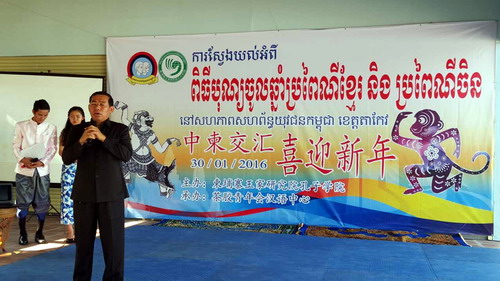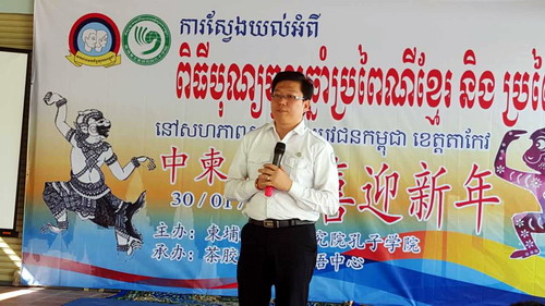 奥奇皮副省长在致辞中表示,茶胶省的中文教师在青年联合会和孔子学院的共同努力下有了极大的进展,亦期待双方进一步合作,为茶胶省汉语事业做出更多贡献。他还用中文祝福大家:恭喜发财!