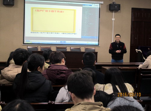 讲座伊始,欧阳天庆以生动切实的问题展开互动,在座同学个个积极踊跃,兴致勃勃。接着,通过动画视频向在座同学普及并解释了《化工企业安全生产禁令》、《生产厂区十四个不准》、《四十一条安全生产禁令》等入厂实习所需注意事项。最后,以图片的形式讲解了一系列关于化工厂设备设施、入厂工作规定、化工企业组织架构等知识。