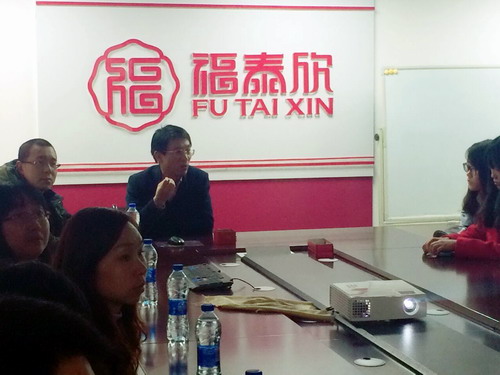 顾总经理向学生们介绍了福泰欣公司的相关情况,包括公司的品牌历史,发展,运作模式,产品以及仓储物流。同时,对公司未来的线上线下的发展情况作了简要概括,并鼓励创业团队学生代表集思广益,努力创业,利用自己所学到的相关知识为福泰欣在电商领域闯出一片新的天地。随后顾总带领大家参观了福泰欣产品展示区,并与指导教师和学生们在产品展示区就产品的性能分类和未来电商销售发展做了深度探讨,学生代表们表示将与团队成员就今日调研的情况进行讨论,并尽快着手落实福泰欣网店的初步规划与建设工作。
