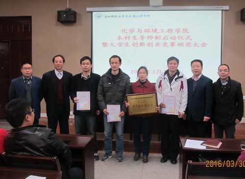 副院长孙德四宣读2015年化环学院在各类省级以上创新创业技能竞赛中获奖名单,并进行了颁奖。获奖学生代表刘京生和指导老师代表谢宝华作了获奖发言。