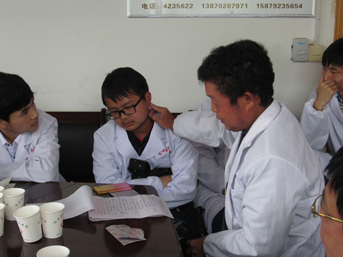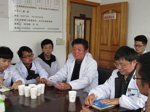 经过一个多小时的车程,大家抵达码头镇中心医院。在会议室,码头镇中心医院何秀山院长对我们的到来表示热烈的欢迎,随后他为大家介绍了码头中心医院的地理位置、医疗资源、财政规模、主要服务对象等基本情况。内科主任朱文学为我们详细介绍了脑出血的发病原因、临床表现、临床诊断、如何与颅内肿瘤进行辨别的方法以及一些控制措施。中医学主任蔡清报讲解了一些中医临床常见病的处理,并重点讲述面瘫的临床表现及处理方法,并现场为医学生做人体示范,这种形象而又生动的演示引起了同学们的极大反响。
