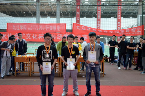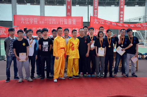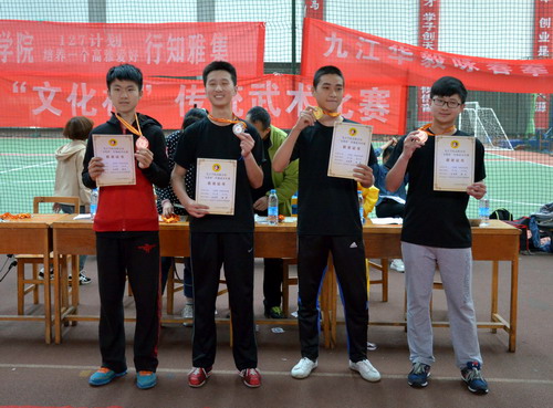 当参加比赛的选手在会场中检录后,武术赛事竞赛——“文化杯”传统武术比赛活动正式开始。赛程共分:规定基础套路,传统套路和器械组三个大类八个小组,在接下来的一个多小时中,参赛选手为大家展示了五步拳,十步拳,咏春拳,长拳和双截棍三段刀术等内容。比赛由三届国际咏春擂台赛冠军,九江华毅咏春拳馆馆长陈则华老师和 学生社联武术协会会长张鹏任裁判长。赛后,在工作人员计算成绩的时间中,陈则华老师为大家示范了咏春拳在二人对战中的作用,张鹏会长也为大家表演了八极拳。经过激烈的竞争,刘刚,刘雪萍,缪世杰和陈文涛等人获得本届“文化杯”传统武术比赛小组冠军。会后,所有参赛选手与裁判员合影留念。