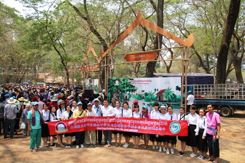 孔子学院师生和柬青年会会员在吴哥宋干节开幕式上合影
