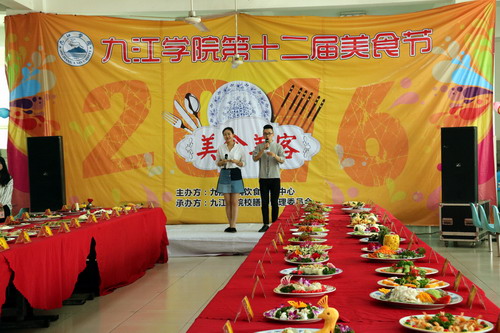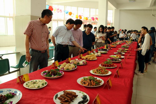 第十二届美食节隆重开幕。校工会主席金葆金、团委书记闫来英、后勤管理处处长姜东升、机材学院党委副书记陈娜等领导在饮食服务中心主任蔡飞陪同下到场观看。