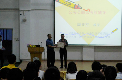 为了提高学生参加企事业单位各类面试的应试能力,提升学生就业水平。邀请周业柱教授在文友楼三楼报告厅举行了《公务员面试考前辅导》专题讲座。周教授根据自己亲身参与各类公务员面试经验,结合自身作为公务员面试考官经验,为同学们详细的介绍了公务员面试。