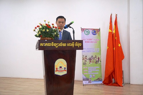 柬埔寨文化艺术部副国务秘书亨维拉阁下(H.E. HEI Virak)对“汉语桥”世界中学生比赛柬埔寨区决赛的举行表示欢迎。他表示,比赛活动将让柬埔寨中学生有机会发挥自己所学的汉语水平,培养参加国际比赛的勇气,并使得他们有机会去中国学习交流,同时他感谢多年来孔子学院对中柬文化交流所做出的贡献。