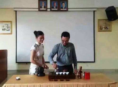 看完精彩的表演后,大家一起品尝了陈慧玲泡好的茶。最后毛万老师在陈慧玲的指导下亲自体验了茶艺表演的整个过程。