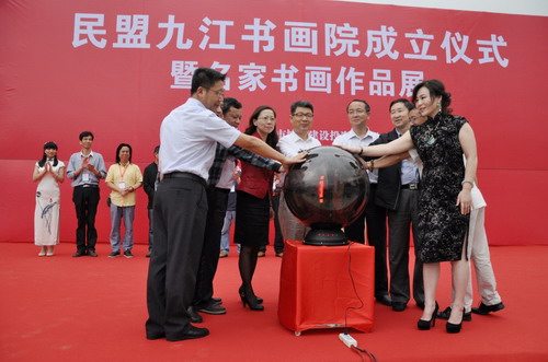 5月29日上午,民盟九江书画院成立暨九江市著名书画家作品展览在九江市水岸莲华销售中心举行,市政协副主席陶春元,市政协副主席、统战部长黄大明,市政协副主席李军,市委宣传部副部长、精神文明办主任刘明华,市委统战部副部长蔡卫宁,民盟江西省委专职副主委任江南,民盟抚州市主委章克敏,民盟九江市主委严平等领导出席开幕仪式。民盟