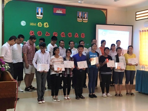 7月3日,柬埔寨王家研究院孔子学院西哈努克省高级中学汉语中心成功举办“汉语知识技能大赛”。西港省教育厅高莱(Kov Lay)厅长、西港高中高吴提(Khov Vuthy)校长、西港省教育局林江(Lim Kheang)老师、中国国家侨办外派教师西港港华学校吕俊桥校长、赴柬志愿者教师西南地区负责人蔡小敏老师、西港经济特区红豆集团李超主任、西港鄂尔多斯鸿骏电力有限公司吴成雷经理、汉语中心柬方负责人王浩(Nivorth)老师以及汉语中心全体教师出席了此次活动。此外,活动还邀请了选手家长和汉语中心师生100余人参加了此次活动。活动由汉语中心赵小雪老师主持。