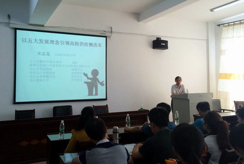 随后,市政府副秘书长宋志龙为大家做了题为《以五大发展理念引领高校供给侧改革》的专题报告。他首先解读了7月8日习近平总书记主持召开经济形势专家座谈会的精神要领,分析了我国坚定不移地推进供给侧结构性改革的深层次原因。接着他从五大发展理念与供给侧改革的背景、高校供给侧结构性改革建议思路、高校在服务于地方经济社会发展中的角色转型等三个方面,紧紧结合江西与九江经济社会发展现状畅谈了地方高校如何推进自身改革、如何提升办学水平、如何凝练办学特色、如何积极有效服务于地方发展。