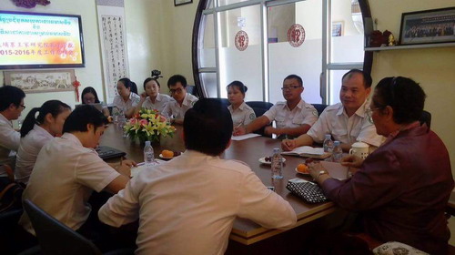 7月26日,柬埔寨王家研究院孔子学院在孔子学院芳华大楼召开2015-2016年度工作总结会议。柬埔寨王家研究院院长、孔子学院理事长克洛媞达院士(H.E.KHLOT Thyda)、柬埔寨王家研究院孔子学院院长谢莫尼勒阁下(H.E. CHEA Munyrith)、中方院长帅式毅先生及各教学点负责人共14人参加会议。