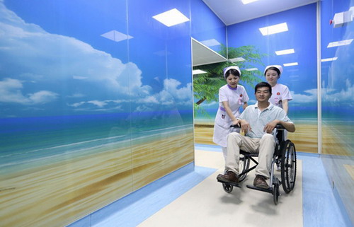 蓝天、碧海、沙滩……在治疗室,逼真美景融入到科技感极强的装修风格中,灯光设定科学而温馨,置身其中如临夏日海滨,类似于将患者仰视的天花板做成可亮光的蓝天白云图案设计,能极大消除其放射治疗时的恐惧感,尽显人文关怀。预约等候区明亮洁净,整排的皮质沙发,清爽而舒适。定位室、制模室、操作室紧挨机房入口,整个治疗区域位于西院住院楼的负一层,计划室、模具室、医生办公室等位于一楼,放疗患者可从病区电梯直达底层,分区布局科学合理。放疗科环境清新自然,令人印象深刻,放疗室的布局和装修独树一帜,秉承了临床医学院/附属医院在改善患者就医体验工作上一贯的高品质格局,充分体现了附属医院“以人为本、以病人为中心”的服务理念和宗旨。