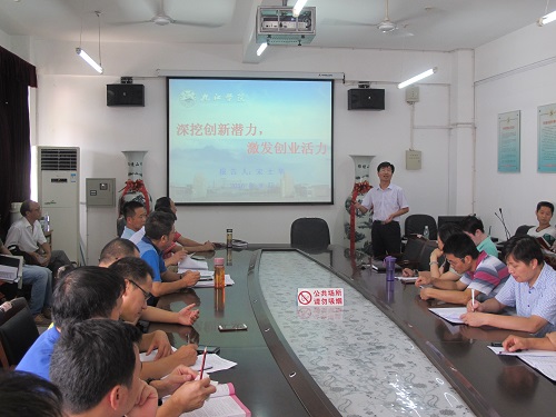 随后,宋处长首先对 大学科技园的现状进行了介绍,对创新、创业的内涵进行了解释并对科技园现在相关的优惠政策进行了详细的解读,并从战略部署、政策导向、活动催化、发展急需、成效初显等方面对学校大学科技园的发展规划进行着重介绍。会上,宋处长鼓励学院教职工积极响应国家“大众创业、万众创新”的号召,加强科研成果的转化力度,积极入园,将成果转化成产品。