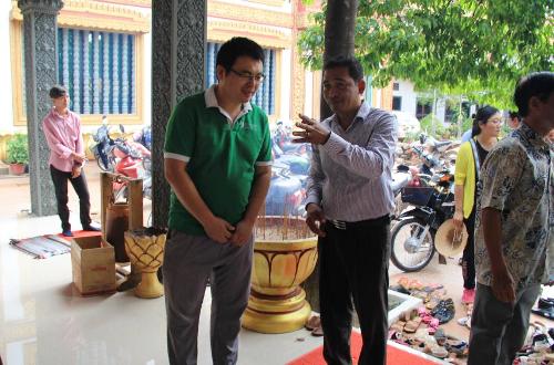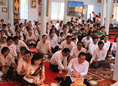 上午9时许,吴哥高中孔子课堂中文教师代表与任诺特校长等一起到达PRASPROMRATH寺庙。首先是聆听僧人诵经,接着暹粒省长钦文松阁下致辞,而后是大家排着长队依次向寺庙布施钱物。活动中,吴哥高中孔子课堂中文教师代表受到钦文松省长的接见,钦文松省长对孔子学院在汉语教学和中柬两国政府及人民友好交流等方面做出的特殊贡献表示赞赏。同时,他向孔子学院教师介绍了他不久前海南之行的收获和感受。交谈中,他提到孔子学院暹粒省政府官员班,对孔子学院免费为暹粒省政府官员教授汉语并提供赴华留学奖学金,积极促进中柬文化教育交流的善行表示衷心感谢。最后,他希望孔子学院进一步加强与省政府的交流合作,在文化教育和导游培训方面取得更大的成果。