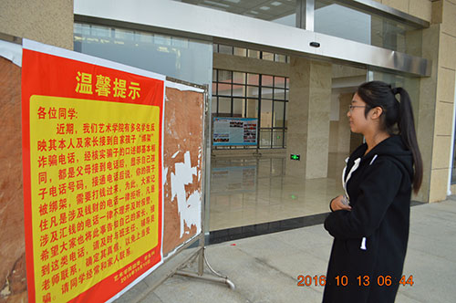 近些年,在互联网金融产业的迅速发展环境下,一些不法分子利用高校大学生人口基数大、消费潜力高、对各种新鲜事物的盲目追求等特点,把学生作为资产端来源开展针对高校学生的网络贷款,造成学生的个人财产损失。学生会整理了相关资料,制作了相关警惕告示及宣传海报张贴于新艺术大楼一楼醒目位置,以便时刻提醒同学们提高安全防范意识,预防电信诈骗。
