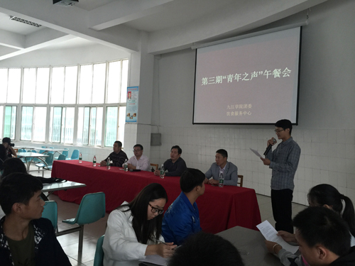 第三期青年之声午餐会。校团委书记闫来英、饮食服务中心主任蔡飞、三食堂经理王焱平、配送中心经理柳欣江共同出席了本次活动,校学生会学生代表李鑫主持了这次午餐会。