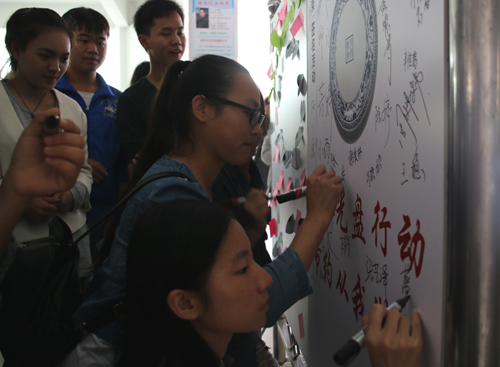 会议第四环节由膳食管理委员会成员、化环学院王婷宣读世界粮食日光盘行动倡议书,呼吁我校全体师生注意文明用餐,做到厉行节约,反对浪费,号召大家积极主动加入光盘行动。全体与会代表共同签名正式启动了本次为期一周的光盘行动。会议结束后,老师与同学们在三食堂共进午餐,就考研、生活、学习等关心的话题作深入交流和探讨。