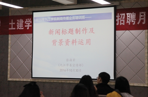 30日下午2:00,“新闻标题制作和背景材料运用技术”专题讲座在望庐楼101教室准时开讲。本次讲座由我校优秀校友、九江市委宣传部网络研究中心副主任张海岩主讲,同时,张海岩还曾是07届校报记者团团长。