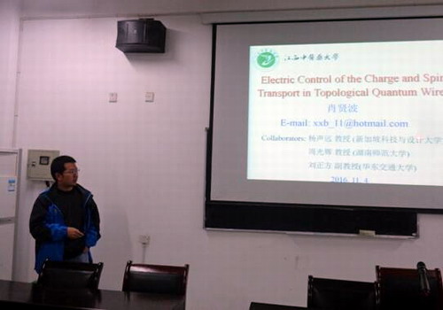 江西中医药大学肖贤波作《Electric Control of the Charge and Spin Transport in Topological Quantum Wires》报告