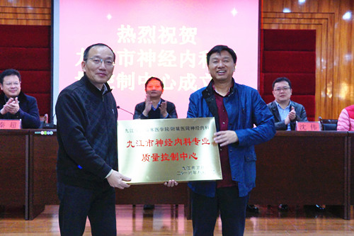 九江市神经内科质量控制中心挂靠临床医学院/附属医院神经内科,市卫计委医政医管与药政科朱衣文科长向聂红兵主任授牌,并对中心成立及新当选的挂靠单位、主任及委员们表示祝贺。他表示,九江市神经内科质控中心的成立,非常有意义,不仅是医改的的需要,也是是医疗行业推广的需要,希望中心能加强建设,履行职责,明确质量管理及行政监测,把中心建立成学习、交流、发展的平台,进一步提升诊疗水平。