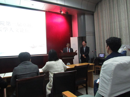 精彩的演讲后,来自巴基斯坦的AFHFAQ教授进行点评,他充分肯定了各位选手的精彩表现,并介绍了当代医学进步的成果,也可以为人类带来福祉。牛力科长在点评时指出医学人文是科技进步与人文精神的结合,不能只注重一方面,要同步发展,同时他也对学生们提出殷切希望:要立志成为一名具有人道主义的好医生。