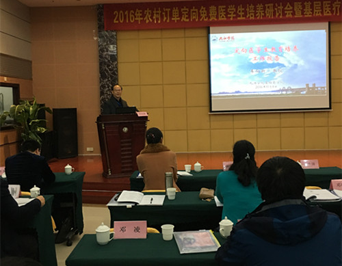 我校基础医学院车向新院长做了“定向医学生教育培养工作报告”,介绍我校自2010年至今连续7年招收并培养农村定向医学生以来,全校上下高度重视定向医学生的培养工作,依托教育部、江西省卓越医师培养试点项目,根据农村基层卫生服务的要求和新变化,结合本校办学定位、人才培养目标、服务面向和办学优势与特色等,制定并不断完善了定向医学生培养体系。围绕为我省城乡基层培养“下得去、留得住、用得上、干得好”的适用型医学人才的总目标,以联合行业(医院)联合制定贴近基层的培养方案为立足点,以培养“基层适用型医学人才”为落脚点,以加强实践教学体系构建为关键点,贯穿职业素质培养与动手能力训练这条主线,大力开展以学生为中心的课程体系改革,定期开展基地教学,强化医学人文教育,培养立志基层、具有奉献精神的卓越基层医生。