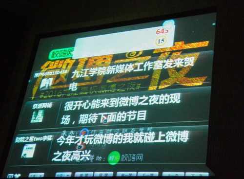 “2016年九江高校微博之夜”12月10日晚在江西财经职业学院举办并获得圆满成功。此次晚会主要围绕“九江高校新媒体发展与打造专职院校红人”展开,通过年度盘点、评选表彰等形式,加强九江高校校园账号和相关部门之间的联系与交流,促进各校学生之间的交流。