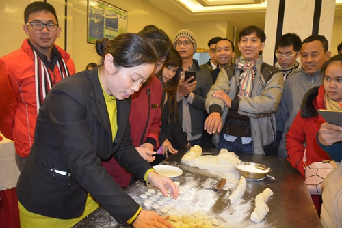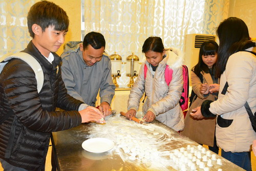 濂溪宾馆内,体验团成员们首先学习了包饺子。和面、揉面、擀皮……在师傅的示范下,一个个精致的饺子渐渐成型。体验团成员们见状纷纷动手,亲手感受擀皮、包饺子等步骤,经过一个多小时的学习练手,战果颇丰。体验团成员、来自柬埔寨亚欧大学的唐赖兴说:“这是我第一次学习包饺子,觉得挺难的,但是过程很有趣。等我回家了,我要尝试一下包给家人吃。”