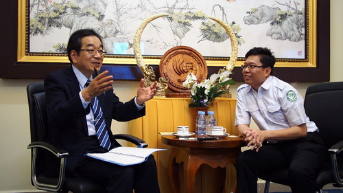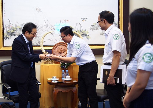 孔子学院院长谢莫尼勒阁下和中方院长夏修龙教授对大塚丰教授的到来表示热烈的欢迎。谢莫尼勒院长介绍了柬埔寨孔子学院的基本情况,他说,柬埔寨王家研究院孔子学院自2009年创办以来,经过7年的发展,现已有27个汉语中心,3个孔子课堂,教学点覆盖柬埔寨12个省市,汉语教师也从最初1人到现如今80人的规模。参加HSK及HSKK考试的学生人数也与日俱增,到华留学的学生人数逐年递增。大塚丰教授对孔子学院近几年取得的令人瞩目的成绩表示祝贺,并致以诚挚的祝福。
