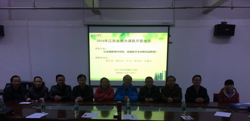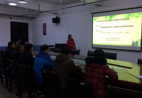 12月23日上午,基础医学院在浔东校区华文楼105室举行2016年立项的江西省教改重点课题《以卓越医师为导向,加强医学生创新创业教育》开题报告会,会议邀请了5位专家评委,基础医学院车向新教授担任专家组组长,专家组成员由基础医学院汪鑫教授,临床医学院黄啸林教授,药学与生命科学学院张小谷教授及基础医学院何巍副教授组成,课题组全体成员及病理教研室全体老师参加了开题报告,车向新院长主持本次开题报告会。
