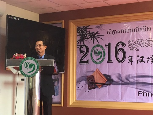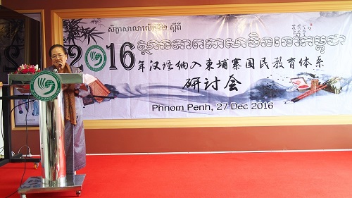 12月27日,为了交流柬埔寨汉语教学经验,探讨汉语纳入柬埔寨国民教育体系的可行性,由柬埔寨王家研究院孔子学院主办的2016年汉语纳入柬埔寨国民教育体系研讨会在柬埔寨孔子学院本部召开。柬埔寨王家研究院院长克罗媞达院士(H.E.Khlot Thyda)、柬埔寨教育青年体育部国务秘书皮查南阁下(Pit Chamnan)、柬埔寨劳工与职业培训部副秘书长得成功(Tes Rukhaphal)、柬埔寨参议院人力资源部主任诺普库克(Nop Kuch)、柬华理事总会副会长罗世兴、蔡伟华、立群学校校长谢智勇等出席会议,柬埔寨孔子学院院长谢莫尼勒(H.E.Chea Munyrith)、中方院长夏修龙及来自柬埔寨亚欧大学、西部大学和陆军学院等单位代表共200余人参加会议。开幕式由谢莫尼勒院长主持。