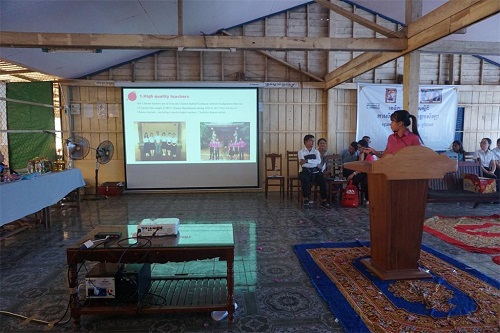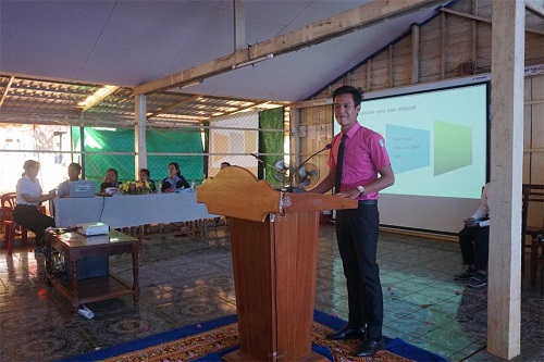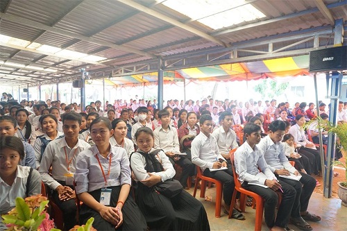 棉芷大学中文系教师到来受到NGO语言学校师生的热烈的欢迎,现场学生有500余人,人气火爆。棉芷大学校长桑那(H.E. SAM NGA)讲话,他介绍了棉芷大学中文系及学习汉语的好处,希望大家报名学习。中文系优秀学生代表笛美(TITH CHEAVOLEAK)和拉威(LOUN RAVY)用柬语向现场学生介绍了棉芷大学中文系,并结合自己学习中文的亲身体会,运用PPT进行生动形象地展示,为在座学生全方位展示了棉芷大学中文系的风貌,让他们感受到汉语的魅力。