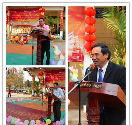 谢莫尼勒院长在致辞中说,孔子课堂自成立以来,取得了一定的成绩,感谢中国大使馆和柬埔寨各界的支持,孔子课堂将继续努力,在汉语教学和文化交流领域更上一个台阶。吴哥高中任诺特校长感谢孔子学院对学校的支持,他说孔子课堂的建立填补了暹粒省中学汉语教学的空白,为众多学生创造了赴中国留学的机会,促进了吴哥高中国际交流。同时,通过孔子学院联系由中方援建的三层教学大楼的建成将极大地改进吴哥高中的教学条件。