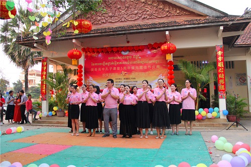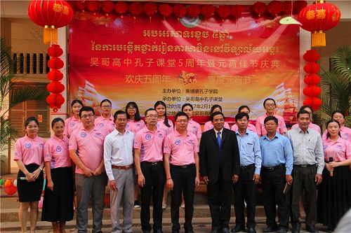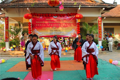 2月12日,柬埔寨孔子学院吴哥高中孔子课堂成立五周年庆典暨元宵佳节庆祝活动在暹粒省吴哥高中举行。暹粒省副省长金财恒(H.E.KIM Chhaihieng)、暹粒省教育厅副厅长李布纳(LY Bunna)出席活动,柬埔寨孔子学院院长谢莫尼勒(H.E. CHEA Munyrith)、中方院长夏修龙、吴哥高中校长任诺特(RIN Lot)及吴哥高中教师、学生和家长400余人参加了庆典。
