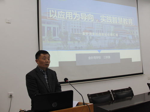 讲座中,江校长结合金砂湾学校教育信息化的应用实际,深刻阐述了“信息技术有什么用?”、“什么时候用信息技术?”两个教育信息化应用的两个规律性问题以及智慧教育的内涵。他指出教育信息化的最终目的是促进教育改革创新,提升教育发展水平,推动教育体系的结构重组、流程再造和文化重构。信息技术为教育教学的变革提供条件和支撑创新。技术与教育融合的根本目的是改造教育,改造学习。如果课堂教学中遇到了困难,常规教学手段解决该困难效率低或者难以解决,而信息技术恰恰具有优势能够帮助解决,这个时候才需要信息技术。智慧教育的内涵江校长则从智慧以及智慧教育的概念、智慧教育框架体系、智慧管理、智慧教学五个方面,运用金砂湾学校的智慧教学案例进行了讲解。