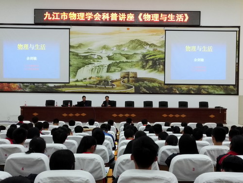 理学院余剑敏老师为修水一中高一学生作了《物理与生活》的科普讲座,与同学们分享了物理中的力、热、电、光方面的知识在生活中的应用及现象的解释等,讲座内容紧围生活中的物理知识,深得同学们喜爱。