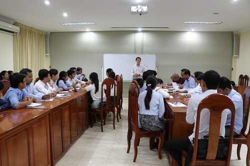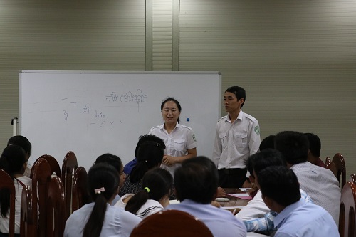 柬埔寨王家研究院孔子学院院长助理陈晶雯代表孔子学院讲话,她介绍了担任司法部汉语中心授课教师的陈明崇老师,她说,陈明崇老师是孔子学院的本土汉语教师,他曾到 和云南师范大学读书,回国后在柬埔寨孔子学院任教,教学经验丰富,也是优秀的中柬翻译人才,为了让司法部官员尽快入门,孔子学院特派陈明崇教师来上课。希望司法部官员们可以爱上汉语,爱上中国,以后有更多的机会去中国。