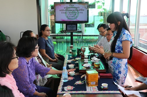柬埔寨孔子学院志愿者教师黄书老师给汉语官员班学员们介绍了中国江西九江的著名茶叶——庐山云雾及其相关知识,并进行了茶艺展示。学员们纷纷表示,一定要珍惜这次赴中国学习和交流的机会,亲身体验中国博大精深的文化。