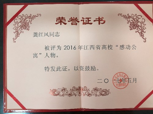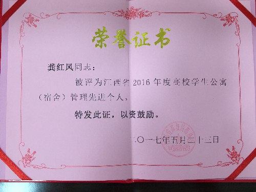旅游与国土资源学院龚红风同志喜获“江西省高校学生宿舍管理先进个人”和“江西省高校‘感动公寓人物’”两项殊荣。