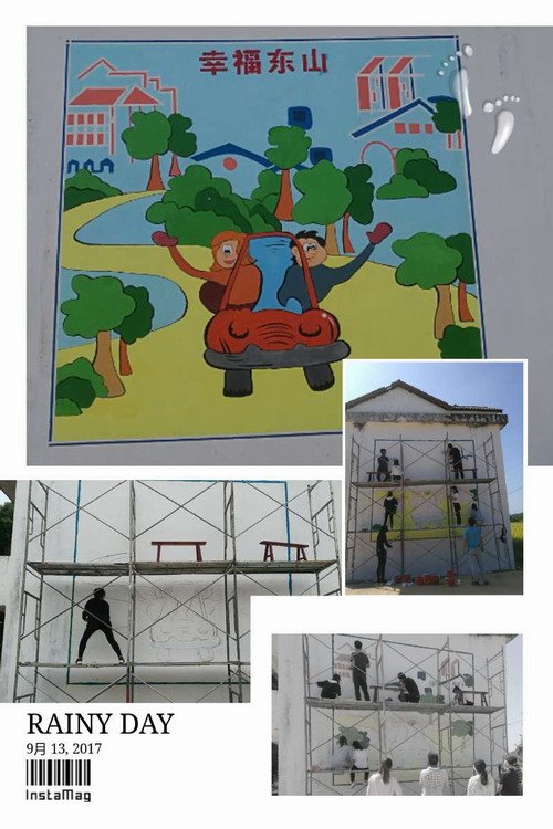 截至9月16日,25名师生在武宁官莲乡东山村历时5天,墙绘面积累计560平方,户外12幅作品已全部圆满完成。学生表示:此次活动虽然很幸苦,皮肤晒得黝黑,但收获颇深。能用自己的双手为新农村建设添砖加瓦,感到非常有意义!若干年后再到东山来,看到一幅幅亲手作品会觉得很自豪。