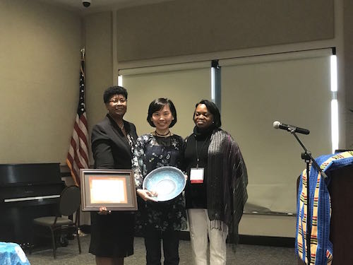 活动最后,萨凡纳州立大学图书馆馆长玛丽·法犹茵(Mary Fayoyin)与信息技术专家德万·巴博(Dwan Barber)一同授予曾李霖教授荣誉证书,并感谢大家参加此次女性领导力会议,邀请大家更多地参与到孔院组织的各项活动中,学习汉语,了解中国文化。