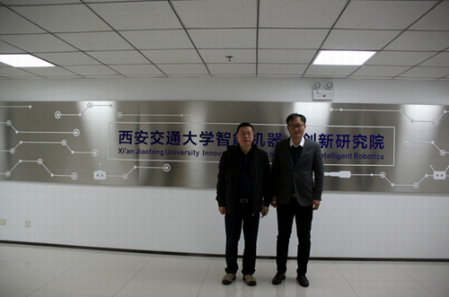 期间,梅龙宝教授参观交流学习了西安交通大学智能机器人创新研究院。该研究院由西安市与西安交通大学共同建立,长江学者、博士生导师、西安交通大学梅雪松教授领衔担任院长。研究院具有优势人才团队、领先的技术、创新的机制,其创新成果及产业化项目,成效显著。赵飞博士引导参观了研究院,并介绍了研究院研制的各类机器人,以及运行机制。