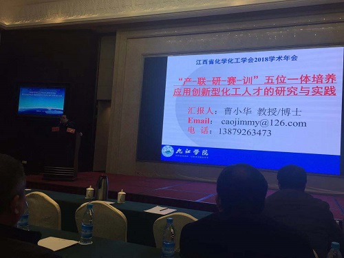 12月8—10日,江西省化学化工学会2018年学术年会暨江西省研究生创新创业学术交流活动化学学科分论坛在南昌市前湖酒店召开。会议由江西省人民政府学位委员会和江西省化学化工学会主办,江西省化学学科联盟、南昌大学研究生院和化学学院承办。会议主题为“新时代、新征程与化学化工科技工作者、研究生的新使命。来自全省各地的化学化工、材料、环保及相关领域的学者、科研人员、研究生及企业家约300人参加会议。江西省科技厅、江西省化学化工学会及化学学科联盟领导等出席会议。化环学院曹小华博士、黄华南博士和药生学院徐常龙副教授应邀参会。